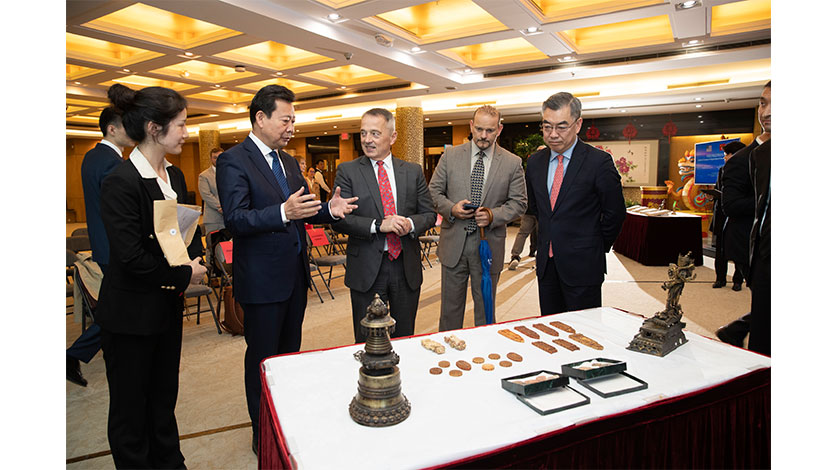 當地時間4月17日,中國文物返還移交儀式在紐約曼哈頓中國駐紐約總領館舉行。美國紐約曼哈頓區檢察官辦公室將繳獲的38件中國流失文物移交中國政府。圖為中國文化和旅遊部副部長、國家文物局局長李群(左二)、美國紐約市曼哈頓區檢察官辦公室古物走私組負責人科洛內爾•馬修•博格達諾斯(右三)、中國駐紐約總領事黃屏(右一)等查看返還文物。 中新社
