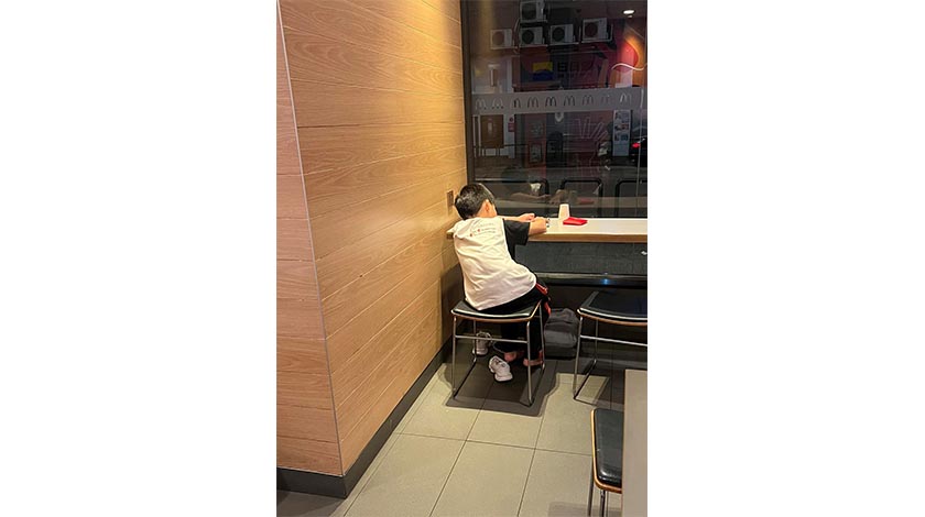 昨早社交網流傳一張圖片,一名穿校服男童將鞋除下,伏在一間餐廳的餐枱上,似在休息,書包放地上。帖文附有文字解說,大意指一名未成年人凌晨時分獨自在北區某快餐店流連。