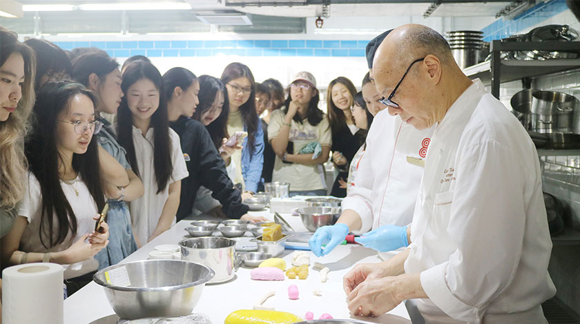 來自永利澳門的點心大師梁曾海師傅主理點心工房及擔任連續14年榮獲米芝蓮星級加冕的餐廳永利軒的點心主廚。梁師傅專注於點心行業超過三十年,擁有豐富的工作經驗,曾在中國、香港及澳門多間知名星級酒店工作。梁師傅秉承選料矜貴,用心製作的理念,希望傳統的點心可以得到傳承,與此同時他也擅長改良傳統點心及加入創意,製作出賣相精緻及口味獨特的新派美點,如工作坊中梁師傅為學生展示的作品——「水晶雞粒粉棵」、「蓮花酥」。本次廚藝示範工作坊令學生不僅豐富了中國廚藝文化的認識,還為他們今後職業生涯積累寶貴經驗。