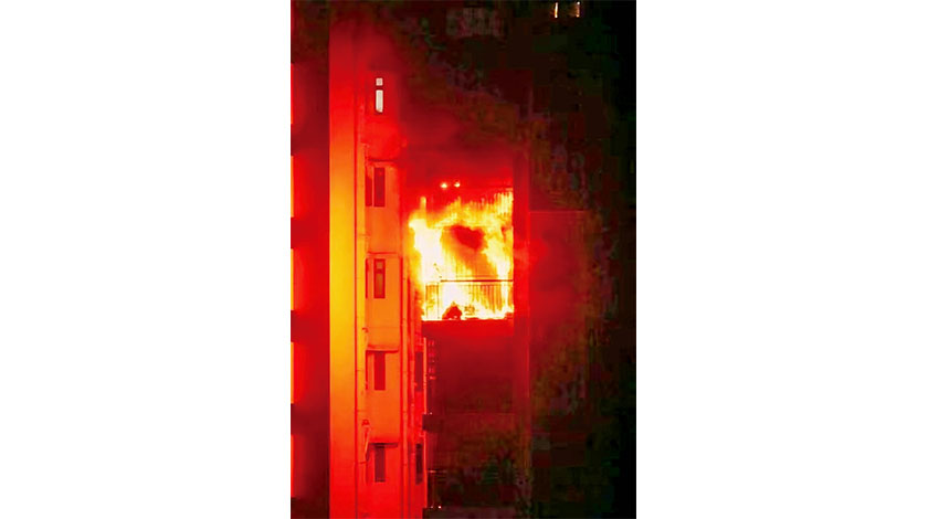昨日凌晨約五時,氹仔北京街湖畔大廈第四座九樓某單位發生火警,火勢猛烈並從窗戶竄出,大廈住戶報警求助。消防接報立即到場,見肇事單位火勢頗大,立即拖喉射水灌救。大廈約一百五十名住戶自行疏散到地面暫避。一名報稱肇事單位女住戶,四十四歲。報稱逃生時被燒傷。經救護員檢查,她右前臂一級燒傷,經護理後拒絕送院。另有一名報稱二十九樓單位的三十六歲女子。報稱吸入濃煙感到氣促,由救護車送往山頂醫院治理。