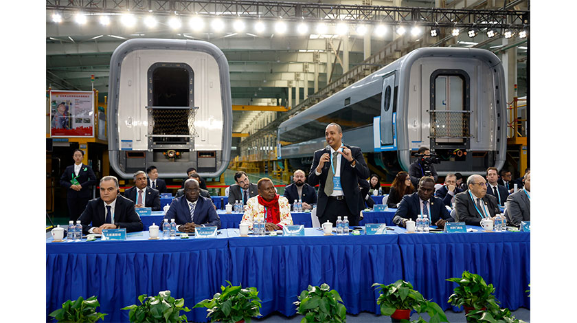 4月29日,河北唐山,中國外交部舉辦“駐華使節步入國企”系列活動之“步入中車”,來自駐華使館和國際組織駐華代表機構的使節走進中國中車集團有限公司,近距離感受高鐵研製過程。在此次活動的舉辦地中車唐山公司,外國駐華使節們實地參觀了高速動車組生產研製現場,並登車體驗了多款綠色、智能列車。圖為尼加拉瓜駐華大使坎貝爾發言並向中車提問。 中新社