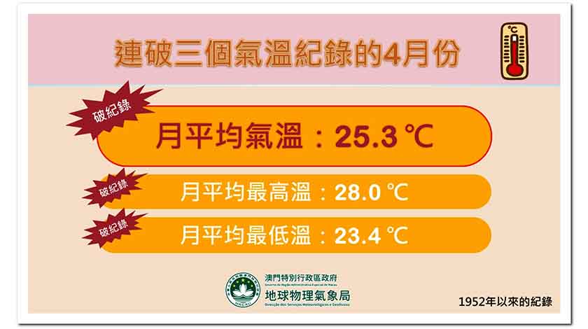 繼本年三月份錄得破紀錄的「日高溫」後,氣象局再錄得四月份「月平均氣溫」高達攝氏廿五點三度,是本澳自一九五二年有紀錄年以來四月份的最高紀錄。同時,四月份的「月平均最高溫」及「月平均最低溫」均打破最高紀錄,分別為攝氏廿八度及廿三點四度。