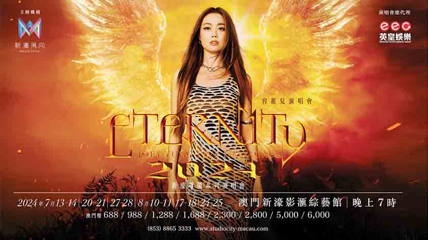 對於載譽於新濠展開第二季度駐唱演,容祖兒表示:「很高興再度踏上新濠影滙綜藝館的舞台,去年的演出反應非常熱烈,讓我感受到來自亞洲不同地方的歌迷對我的熱情,令我非常震撼又很感動。非常期待將於7月開始的全新季度《新濠尊屬系列容祖兒Eternity演唱會》的演出,讓我可以再度透過為新濠量身構思及編排專屬以「Eternity」為概念的全新舞台演出內容,與觀眾沉醉於最美麗的容祖兒永恆夢幻音樂世界。今個夏天,誠邀亞洲樂迷到新濠影滙綜藝館與我一起投入新濠限定的音樂世界,共渡一個『全身暑假』。」