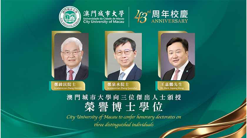 【特訊】澳門城市大學將向鄭緯民、鄭泉水、王嘉鵬頒授榮譽博士學位,以表彰前述人士在各自領域的卓越成就,為社會和高等教育發展做出的重大貢獻。城大榮譽博士頒授典禮暨2023/2024學年畢業典禮將於6月2日(星期日)上午11時假澳門塔石體育館舉行。同場,城大應屆博士、碩士和學士學位的畢業生將獲頒學位證書。本次典禮設有線上直播,以便各地畢業生及其親友觀禮。