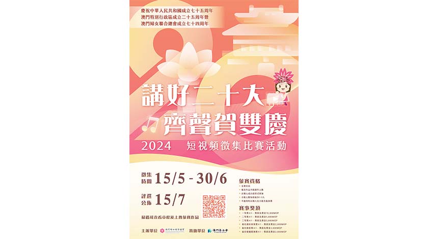 【特訊】由澳門婦女聯合總會主辦、澳門基金會贊助的“講好二十大,齊聲賀雙慶”短視頻徵集比賽活動,由5月15日至6月30日接受報名,誠邀全澳市民、學校組織學生團體報名參加,期望透過搭建市民樂於參與、便於參與的平台,推動全民學習、講好二十大精神,共賀“雙慶”。