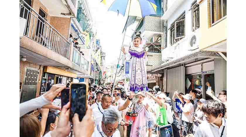 香港長洲舉行太平清醮會景巡遊。5月15日是農曆四月初八佛誕日,香港長洲舉行太平清醮會景巡遊,由各街坊及團體派出飄色、醒獅、麒麟、樂隊和潮州大鑼鼓等,沿長洲主要街道巡遊表演,讓兩旁觀眾欣賞。(香港中通社)