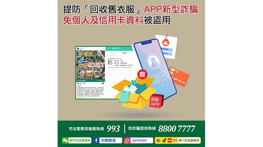 【特訊】近日司法警察局接獲市民舉報,指在網上瀏覽到「高價上門回收舊衣服」的帖文,經商議及按指示支付小額的“預約費”後,最終發現信用卡被盜用。有關手法如下: