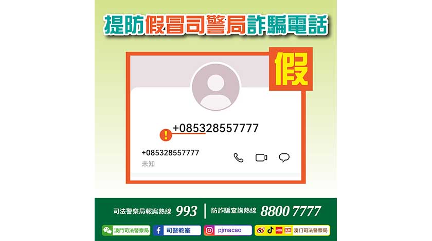 【特訊】司警局昨日接獲市民檢舉,指收到假冒司警局總部報案及緊急行動中心來電“+085328557777”,對方自稱司法警察局警員,直接說出事主的姓名及身份資料,訛稱事主在內地開設手機號碼發送大量詐騙短訊,並要求事主撥打“內地公安電話"盡快處理有關事宜,否則其回鄉證將被註銷。幸事主機警立即掛線,並主動致電本局查詢才識破騙局。