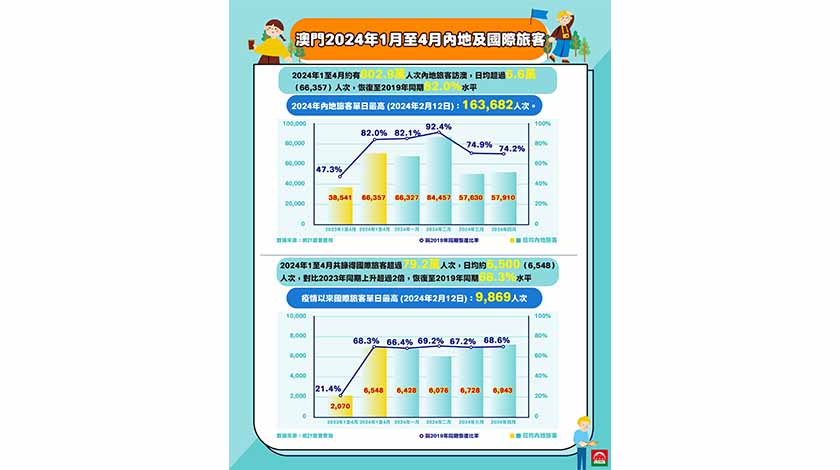 臨時數據顯示,2024年1至4月澳門的入境旅客約1147.6萬人次,日均近9.5萬(94916)人次,整體旅客按年同比增加59.0%,並恢復至2019年同期83.2%水準。