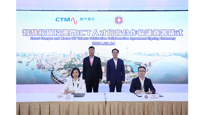 “澳門電訊和澳門培正中學智慧校園及ICT人才培育戰略合作協議簽署儀式”於5月24日下午假BEYOND國際科技創新博覽中澳門電訊展館舉行。在澳門培正中學校長高錦輝、澳門電訊行政總裁潘福禧的見證下,由培正中學總務主任駱劍峰及澳門電訊商務副總裁湛寶儀共同簽署。