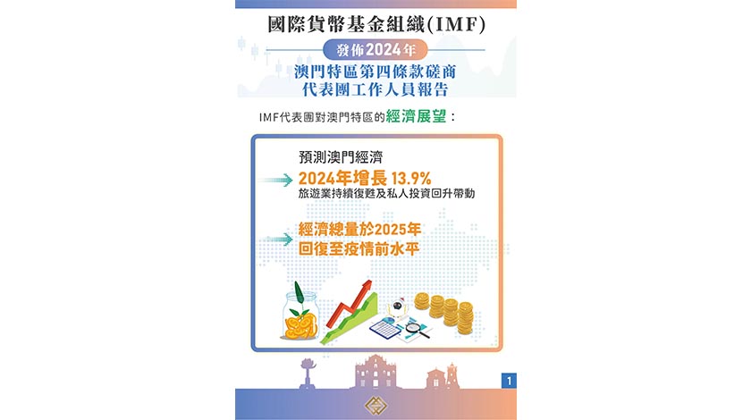 【特訊】國際貨幣基金組織(IMF)總結2024年澳門特別行政區的第四條款磋商,並於昨日發佈代表團工作人員報告。代表團對特區政府推動經濟適度多元發展的工作表示肯定,並預測澳門特區經濟今年將錄得13.9%的增長。