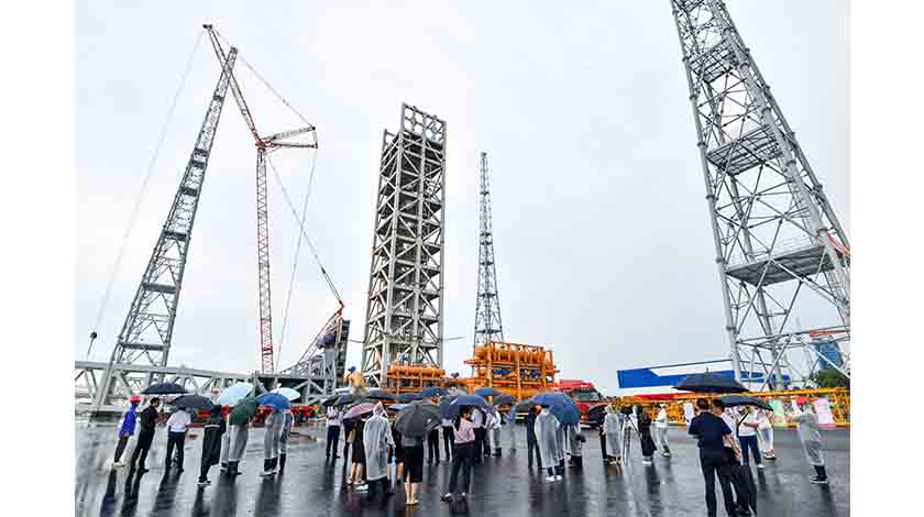 6月6日海南文昌,中國首個商業航天發射場——海南商業航天發射場二號發射工位建成,標誌著中國首個液體通用型發射工位竣工。該發射工位可滿足10余個型號火箭發射需求。圖為出席竣工儀式的嘉賓參觀海南商業航天發射場二號工位。 中新社