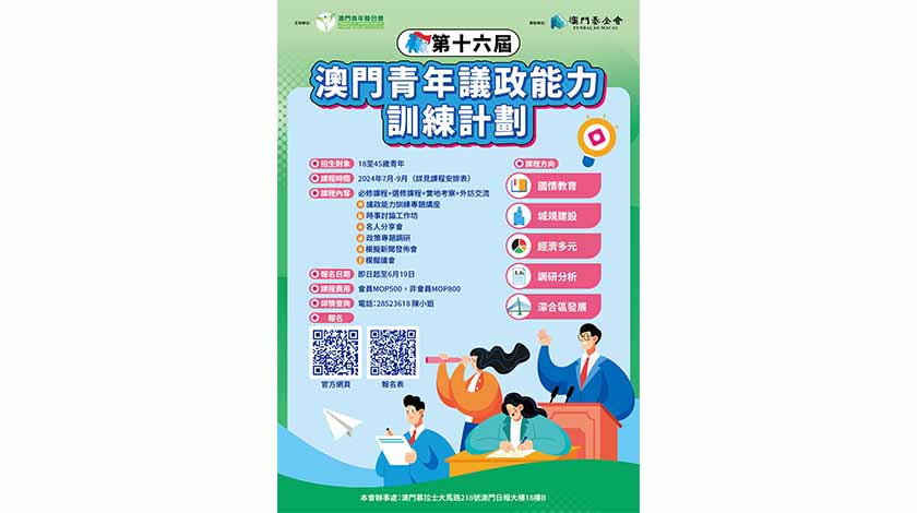 【特訊】6月7日下午4時,澳門青年聯合會於辦事處舉行“第十六屆澳門青年議政能力訓練計劃”新聞發佈會。該會副理事長劉雅樂,常務理事兼活動委員會主任林詠傑,理事兼活動委員會副主任陳彩虹、冼家亨出席並介紹詳情。