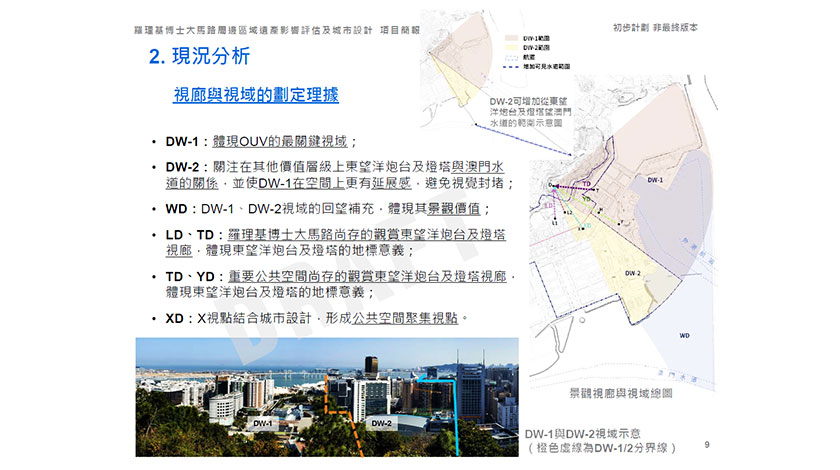 初稿表明,DW-1(東望洋炮台及燈塔向東外港方向俯瞰)是體現「世界遺產的突出普遍價值」(OUV)的關鍵視域。而DW-1對開海面列為WD,初稿表明,從WD回望可體現燈塔的景觀價值。