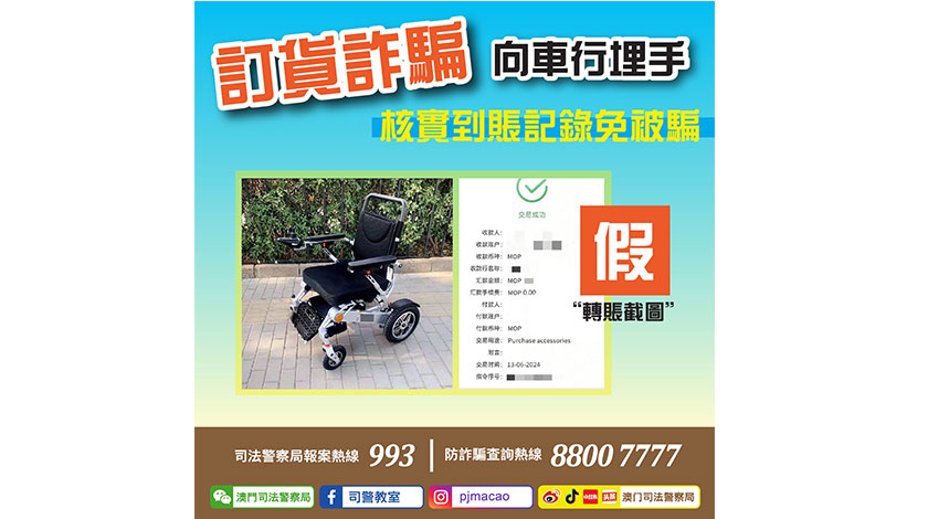 【特訊】司警局近日接獲本澳某車行負責人檢舉,指收到騙徒假扮“消防局職員”來電,表示欲向有關商戶訂購大量汽車電池。隨後,騙徒再訛稱因與“供應商”反目,故請求商戶協助訂購銷售範圍以外的一批輪椅,並讓商戶從中賺取佣金,同時發送偽造的貨款“轉賬截圖”,降低商戶戒心,以跨行轉賬需時未能即時到賬為由,催請商戶先行向“供應商”支付貨款。事後,商戶翻查銀行記錄,並未發現有關款項到賬,對方失聯,始知被騙。