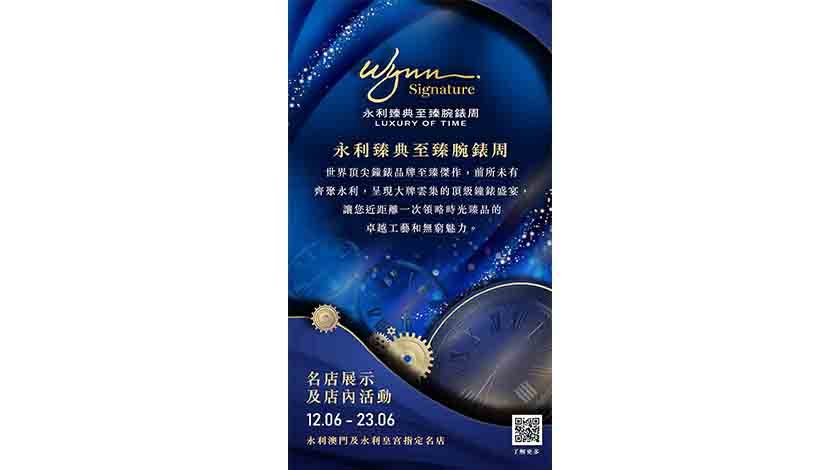 【特訊】永利渡假村旗下全新度假體驗品牌「Wynn Signature 永利臻典」將於即日起至 6 月 23 日於永利澳門及永利皇宮呈獻「永利臻典―—至臻腕錶周」,攜手 18 個世界頂尖鐘錶品牌, 其中包括寶格麗 (BVLGARI)、尚美巴黎(Chaumet)、蕭邦(Chopard)、格拉夫(GRAFF)、宇舶表(Hublot)、IWC 萬國錶(IWC Schaffhausen)、積家(Jaeger-LeCoultre)、浪琴(Longines)、沛納海(Panerai)、伯爵(Piaget)、羅杰杜彼(Roger Dubuis)、蒂芙尼(Tiffany & Co.)及江詩丹頓(Vacheron Constantin)等,於永利皇宮「鴻翊廷」、永利澳門及永利皇宮指定名店展出超過 140 款至臻傑作,總價值超過澳門幣一億五千七百萬,當中包括世上極罕見的稀世珍寶及於澳門首次展出的奢華腕錶,呈現大牌雲集的頂級腕錶盛宴。