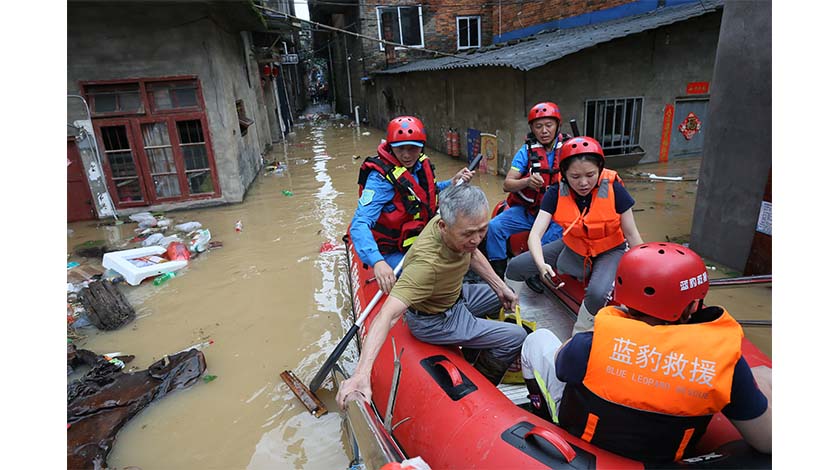 6月16日,福建省南平建甌市陶朱巷路段,福建省藍豹救援隊建甌突擊隊的隊員攜帶專業救援設備與通濟街道、社區干部和志願者排查轄區老人和低窪處居民,勸導並幫助他們轉移到安全地帶。據福建省南平市防指消息,6月9日8時-16日15時,該市普降暴雨或大暴雨。截至16日12時,南平市7405名防汛責任人下沉一線,轉移危險區域民眾10911戶26300人。 中新社