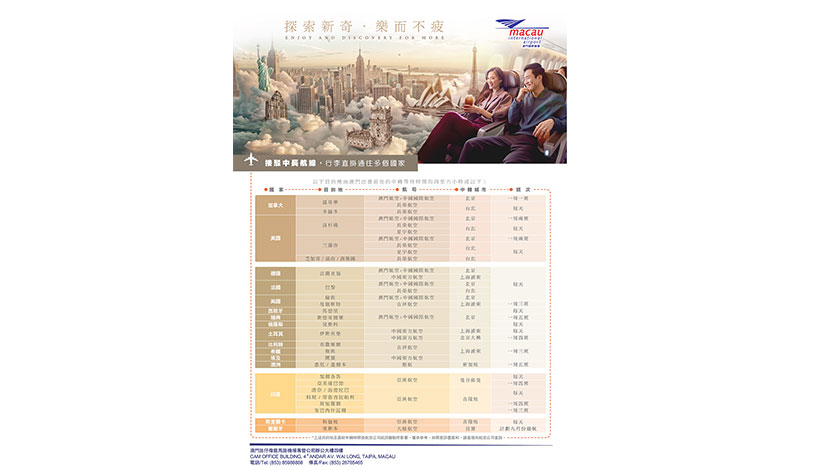【特訊】澳門國際機場持續拓展更多元化航線及航空公司,旨在優化澳門出發的網絡覆蓋度及提升旅客的使用體驗。隨著更多航空公司的加入,旅客可從澳門出發利用一票到底行李直掛的方式,輕鬆到達多個不同的國家和地區。