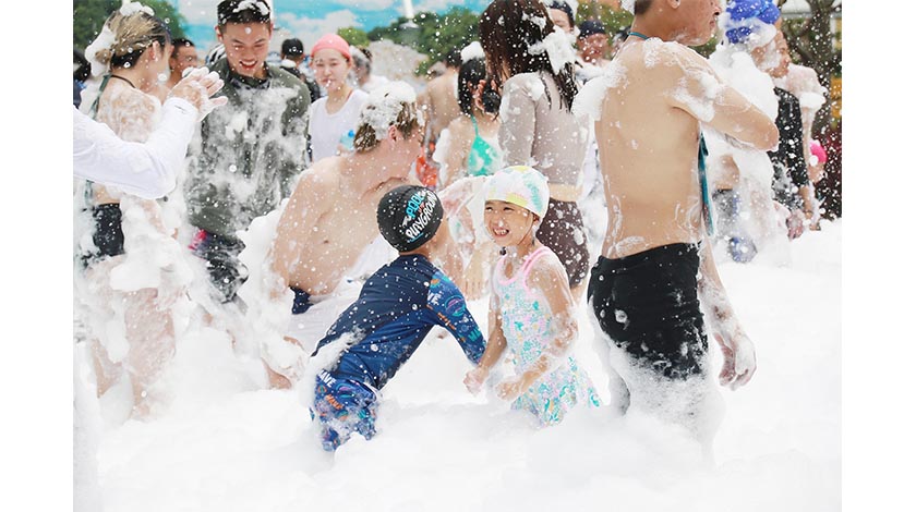 台灣民眾前往水上樂園消暑。夏至剛過,宣告夏季正式到來!台灣中部地區高溫炎熱,民眾前往台中馬拉灣水上樂園遊玩泡泡趴活動。(香港中通社)