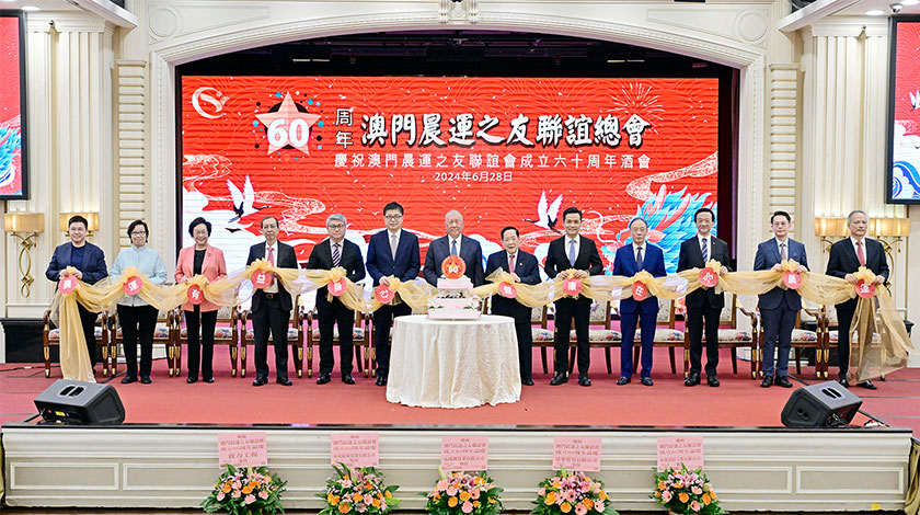 【特訊】澳門晨運之友聯誼總會昨日假萬豪軒舉行“慶祝澳門晨運之友聯誼會成立六十周年酒會”。全國政協副主席何厚鏵,中聯辦宣文部部長萬速成,澳門晨運之友聯誼總會創會主席許世元,澳門特區體育局局長潘永權,澳門特區衛生局局長羅奕龍,澳門中總永遠會長馬有禮,鏡湖慈善會副主席黄國勝,澳日讀者公益基金會會長賀定一,澳門潮屬社團總會主席劉藝良,澳門同善堂值理會副主席鄭秀明,澳門晨運之友聯誼總會主席李俊鳴,澳門晨運之友聯誼會會長徐家頴,澳門晨運之友羽毛球會會長陳隆成等主禮嘉賓,以及政府有關部門、各界社會賢達和澳門晨運之友“四會”會務負責人等近五百名嘉賓出席。