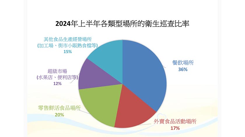 巡查場所中,餐飲場所佔三成六、零售鮮活食品場所佔兩成,外賣食品場所佔一成七( 詳見附圖)。市政署昨表示,今年上半年巡查中,整體食品安全及衛生向好。而為迎接暑假旅遊及餐飲消費旺季,市政署指,會持續派員走訪本澳各區零售鮮活食品場所、食肆及外賣店等,向從業人員進行食品安全及衛生宣教。同時,市政署食品安全廳從恆常收集發生在世界各地新近的食安議題和資訊,剖析其風險來源或成因編寫成《風險簡訊》,為食品業界提供更詳盡的科學 訊息、監管措施及食安預防建議等,加深業界的風險意識,積極採取防範措施,共同降低發生食安問題的風險。