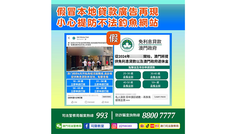 【特訊】近日,司法警察局於網上社交平台再次發現有人以本地區名義發佈不實貸款廣告,廣告內容載有澳門特別行政區區徽,並訛稱澳門政府將提供“免利息貸款”,要求有意者按相應年齡層點擊廣告附帶之連結進行申請。點擊上述連結後將會跳轉到另一個設置了多個貸款廣告之頁面,點擊相關廣告將會隨機出現各個鄰埠銀行及其他來歷不明之貸款網站,真偽存疑。