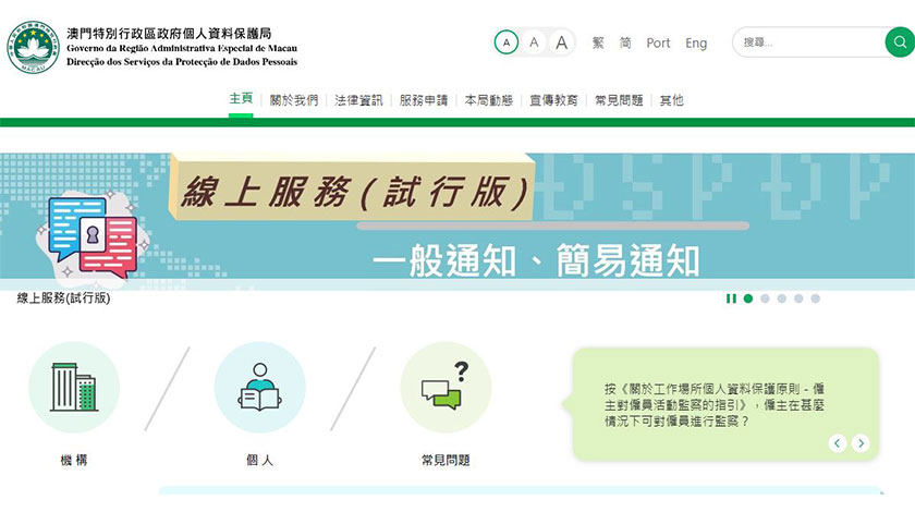 【特訊】為配合特區政府電子政務的發展,個人資料保護局(下稱個資局)增設線上服務系統,協助公、私營機構或市民更好地履行第8/2005號法律《個人資料保護法》規定的通知義務。