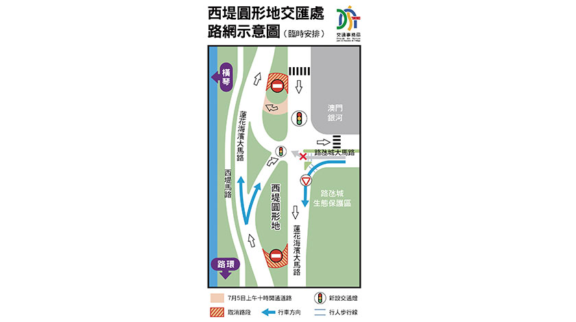 其中,將暫時取消路氹城大馬路右轉入蓮花海濱大馬路的轉向,同步將提前取消西堤圓形地南側回轉處,由路氹城大馬路往奧林匹克游泳館圓形地方向之車輛,需繞道至海濱圓形地調頭,該措施將維持至周邊一帶路網重整工程結束,以減低現時相關路段的交通壓力。