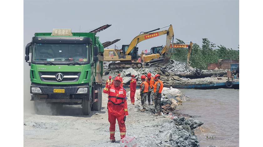 【中新社岳陽7月8日電】(作者 白祖偕 付敬懿 楊華峰 徐志雄)一輛輛載滿石料的運輸車有序駛向決口,水中運輸船上的挖掘機持續展開作業……8日15時許,湖南華容縣團洲垸洞庭湖大堤決口封堵處塵土飛揚,通過水、陸兩端,塊石等物料持續向決口處投放。