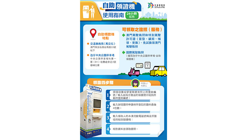除增加自助領證地點外,局方亦擴展自助領證計劃的服務範圍。同日起,申請人無論於線上(可參考https://www.dsat.gov.mo/dsat/lic_services_photo_doc.aspx)或線下辦理涉及澳門駕駛證照的相關服務,包括通過駕駛考試合格所新簽發的駕駛證照,以及續期、更換或補發駕駛證照,均可自行選擇透過該兩部自助領證機24小時自助領取。但設於馬交石的自助領證機暫未能領取國際駕駛執照,敬請市民留意。