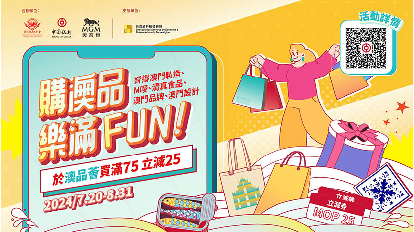 「購澳品 樂滿FUN!」計劃由2024年7月20日至8月31日,每天在中銀手機銀行派發25元澳品薈的電子優惠券,顧客在澳品薈單筆購物滿澳門幣75元並用中銀手機銀行支付,即可立減25元。計劃之啓動禮7月17日假澳門美高梅宴會廳舉行,主禮嘉賓包括澳門特區經濟及科技發展局戴建業局長、澳門廠商聯合會崔煜林會長、中國銀行(澳門)股份有限公司陳榮達副總裁,澳門生產力暨科技轉移中心關治平理事長以及美高梅中國控股有限公司總裁及執行董事馮小峰。
