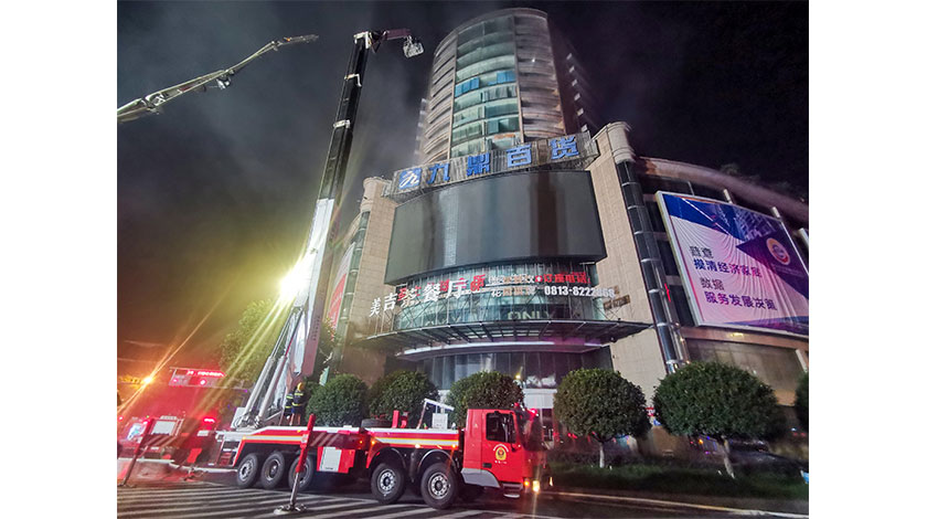 7月18日淩晨3時,四川省自貢市九鼎大樓“7·17”火災事故現場救援結束,圖為消防救援車正在火災現場開展滅火和救援工作。 中新社