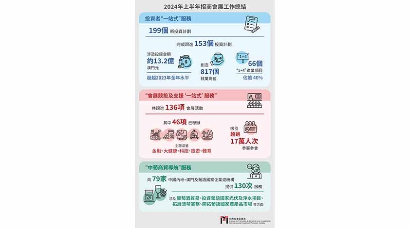 此外,招商部門於上半年主/承辦了“2024年澳門國際環保合作發展論壇及展覽”(2024MIECF)及“第15屆國際基礎設施投資與建設高峰論壇”(15th IIICF)兩項大型會展活動。期間共安排逾650場商務洽談,簽署逾80份項目協議。共舉辦4場“一會展兩地”活動,約140位與會者參加。“會展競投及支援‘一站式’服務” 共跟進136項會展活動,主題涵蓋金融、大健康、科技、旅遊、體育等,其中46項活動已在上半年舉辦,吸引超過17萬人次參展參會。