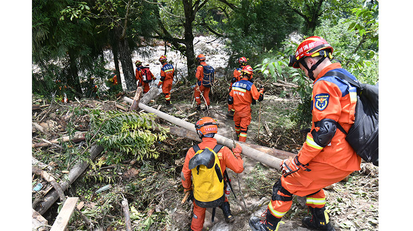 7月22日,四川漢源,消防救援人員在河道中搜尋失聯人員。截至7月21日16時,發生在四川省雅安市漢源縣馬烈鄉的山洪泥石流災害已致10人遇難,仍有29人失聯。 中新社