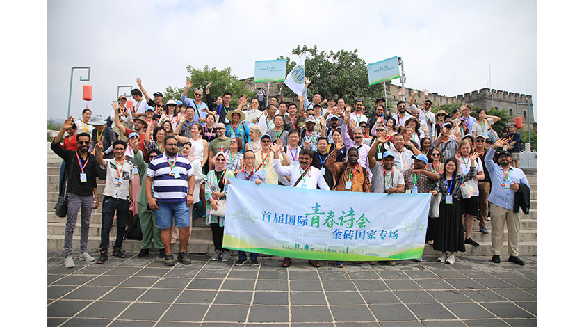 7月23日,首屆國際青春詩會(金磚國家專場)在北京舉行,參會的金磚國家詩人一同參訪慕田峪長城。圖為國際詩人在長城景區內合影。 中新社