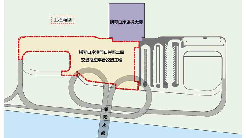 公共建設局介紹,為優化横琴口岸澳門口岸區二層交通樞紐平台的交通環境及相關配套設施,提升交通樞紐平台的運行效率及通關環境,為澳琴兩地的通關人士提供更便捷的通關設施,繼横琴口岸澳門口岸區二層交通樞紐北側平台於去年九月完成改造及開放使用後,南側平台的改造工程亦已展開,是次南側平台的施工面積約爲三萬二千平方米。