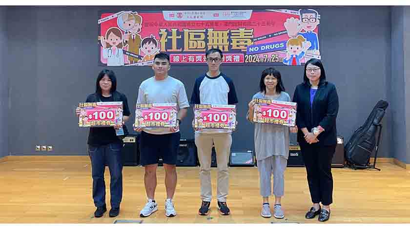 由澳門工會聯合總會工人醫療所主辦,社工局贊助的“社區無毒NO DRUGS”,昨假健康生活教育園地舉辦線上遊戲頒獎禮,希望藉此讓家長和青少年,提高警覺及意識到毒品的危害,並學會防毒、拒毒,以加強宣傳社區預防濫藥教育工作。是次活動約有二千三百名本澳居民參加,全答對問題及累積分數可進行抽獎,獎品包括IPAD、Switch遊戲主機、氣炸煱等。