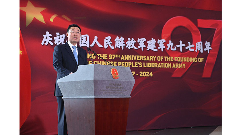 當地時間7月25日,華盛頓,中國駐美國大使館舉行慶祝中國人民解放軍建軍97周年招待會。圖為中國駐美大使謝鋒致辭。謝鋒表示,大國對全球戰略穩定負有關鍵責任,和平發展的世界需要總體穩定的中美關係。中美選擇和平與團結,冷戰熱戰就打不起來;中美選擇開放與合作,世界發展繁榮就有希望。 中新社