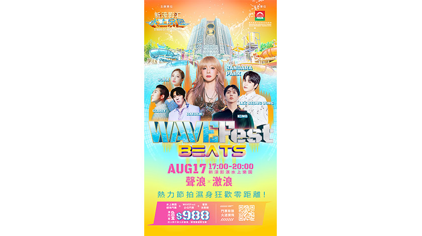 WAVEFest BEATS必會為觀眾帶來超強勁節拍,南韓傳奇女團2NE1成員SANDARA PARK、著名韓國男團INFINITE成員李成種、 和饒舌歌手及舞王KINO,將帶來連場火辣的勁歌熱舞。榮獲「世界百大女DJ」第33名的DJ SURA、5度獲邀參與世界最具規模電子音樂節之一的Ultra Music Festival 的DJ RAIDEN、韓國夜店與派對最炙手可熱的超人氣男神DJ GLORY亦會坐鎮17日的水上音樂節,並會施展絕技為樂迷帶來連串電子派對舞曲,勢必將氣氛推至頂點。