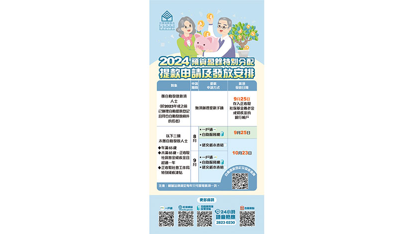 社會保障基金提醒未辦理自動提款登記的人士,可於今年作提款申請的同時辦理登記,翌年起如有預算盈餘特別分配而又符合自動發放條件,無須辦理任何手續,款項會自動存入其正收取養老金或殘疾金的銀行帳戶,省時便捷。居民可隨時透過“一戶通”及社保基金網站的專題網頁查詢自己是否已辦理自動提款登記,及是否符合當年款項的自動發放條件。