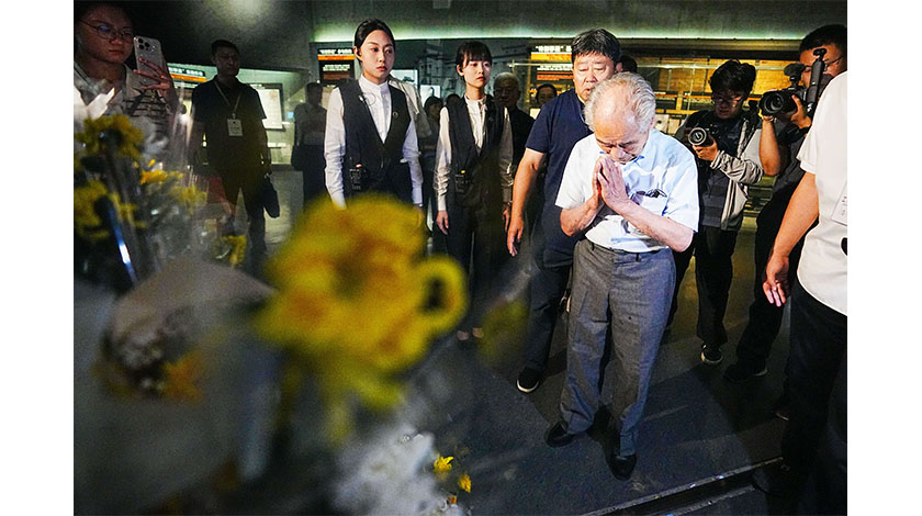 8月13日,清水英男在侵華日軍第七三一部隊罪證陳列館內的殉難者名單前祈禱。新華社