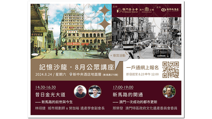 首場講座將於8月24日(六)下午2時半在新中央酒店地面層(澳門亞美打利庇盧大馬路270號)舉行,講者城市規劃師林翊捷與遺產學會副會長勞加裕共同主講 “昔日金光大道──新馬路的前世與今生”,次場下午5時則由澳門特區政府文化遺產委員會委員邢榮發主講 “新馬路的開通──澳門一次成功的都市更新”。兩場講座從多角度了解新馬路是如何的 “誕生”,以及從城市規劃、都市更新、旅遊業發展等的視角,審視這條上世紀守護澳門 “經濟脈絡”的大道,如何在歷史上發揮其獨特的角色,當中又隱藏了多少的有趣故事。