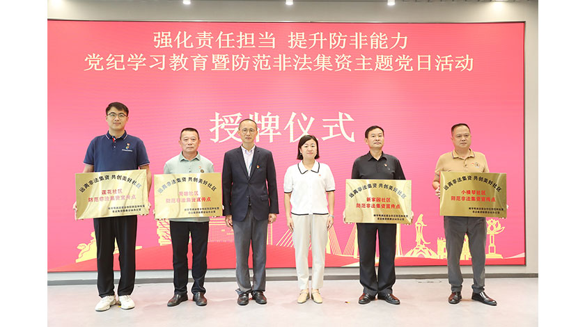 池騰輝局長、張體蘭副處長共同爲合作區荷塘社區、新家園社區、小橫琴社區、蓮花社區授予防範非法集資宣傳牌匾,正式與社區建立防範非法集資宣教協同機制,在社區設置防範非法集資宣傳點,打通防非宣傳教育“最後一公里”。
