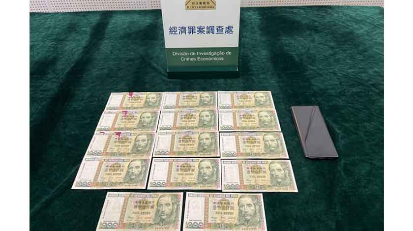【本報訊】一名內地男子企圖以不流通的秘魯貨幣改裝而成的千元港幣偽鈔、到賭場兌換籌碼,被職員識破,司警接報到場將男子拘捕,撿獲十四張偽鈔。疑人辯稱不知道鈔票是偽鈔。