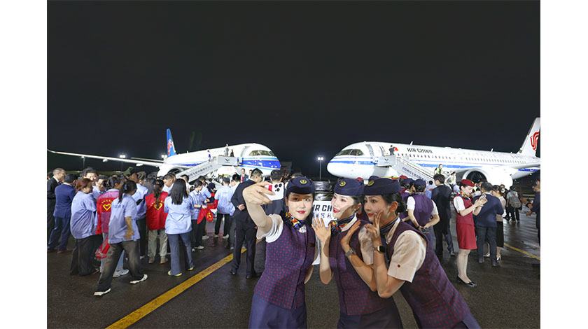 8月28日,中國南方航空公司乘務員與C919國產大型客機合影。當晚,中國國際航空公司和中國南方航空公司在中國商飛總裝製造中心浦東基地同時接收首架C919國產大型客機。這標誌著C919國產大型客機即將開啟多用戶運營新階段。 中新社