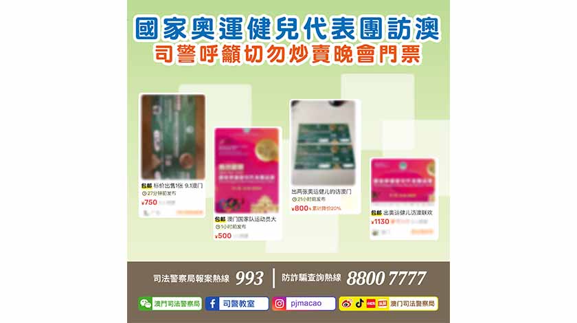 【特訊】近日,司法警察局發現有人於網絡社交平臺炒賣“我們的驕傲—國家奧運健兒代表團澳門聯歡晚會”門票。