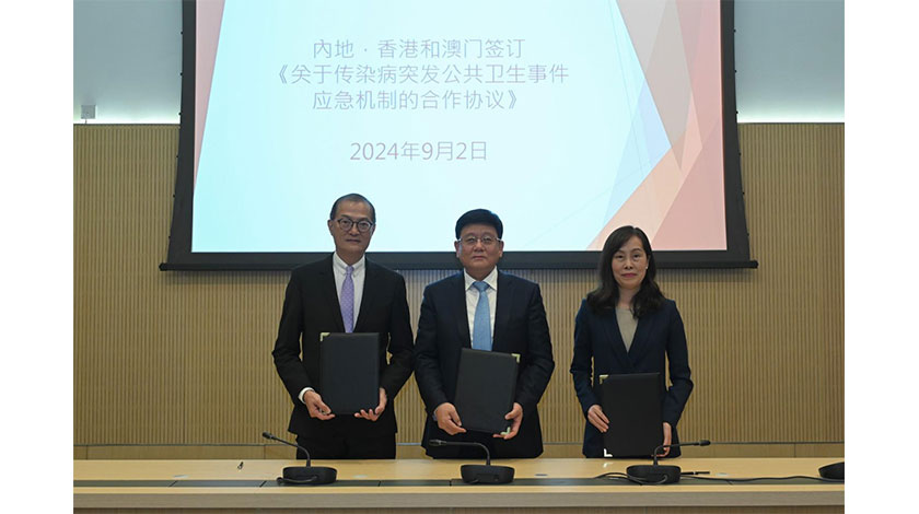 隨後,王賀勝局長、盧寵茂局長、歐陽瑜司長共同簽署了《國家疾病預防控制局、香港特別行政區政府醫務衞生局、澳門特別行政區政府社會文化司關於傳染病突發公共衛生事件應急機制的合作協議》,旨在加強三地在應對重大傳染病突發公共衛生事件領域的合作與交流,按照“一國兩制”原則,根據相關法律、法規,共同應對重大的傳染病爆發流行,切實保障民眾的健康和生命安全,維護社會穩定和經濟持續發展。協議內容主要包括三地應對重大傳染病突發公共衛生事件領域的合作範圍與機構;信息通報、使用和發佈;人員交流與技術培訓;三地應急協調和聯防聯動;科研合作與交流等。