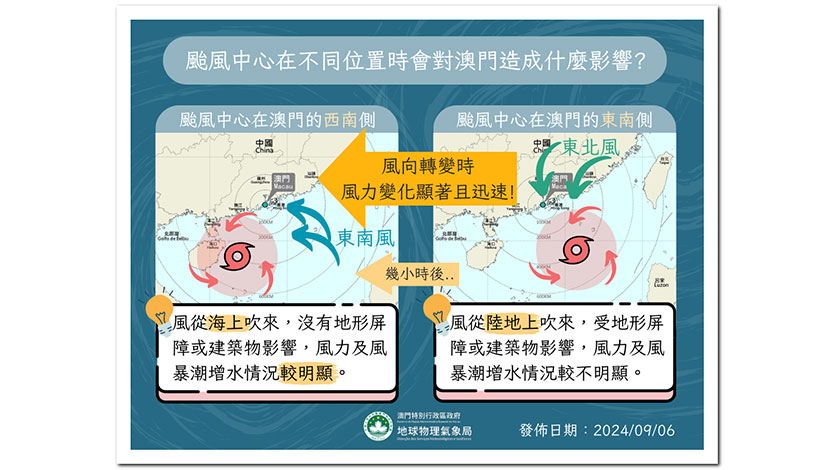 由於位處北半球的熱帶氣旋,氣流會逆時針旋轉。因此,當熱帶氣旋位處澳門的東南側,風較多從陸地吹向海洋,受地形屏障影響,風力會有所減弱;反之,當熱帶氣旋位處澳門的西南側,由於風從海洋吹向陸地,在地形屏障明顯減少下,風力一般較強。因此,有時距離雖近,又或同一距離,卻會帶來不同級別的風力。