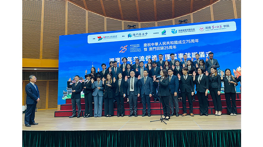 【本報訊】湘澳青年交流促進會昨假科學館會議中心舉行「慶祝中華人民共和國成立七十五週年暨澳門回歸廿五周年湘澳青年交流促進會理監事就職儀式暨認識毛澤東為人民服務的領袖座談會」。新一屆理監事成員增加了來自醫療、教育、社會服務、文創和工商業等領域,涵蓋面持續拓展,從而有助進一步促進湖南和澳門兩地之間文化、經濟、產業以至青年培養及扶貧等工作。