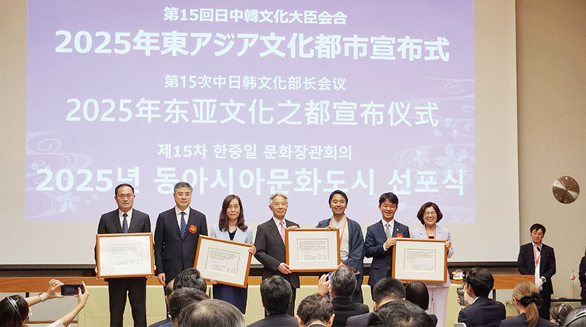 第十五次中日韓文化部長會議於昨日在日本京都舉行,其間舉行了2025年“東亞文化之都”授牌儀式,由三國文化部門代表:中華人民共和國文化和旅遊部副部長張政、日本文部科學大臣盛山正仁及韓國文化體育觀光部第一次官龍昊聲分別向中國澳門特別行政區、中國湖州市、韓國安城市及日本鎌倉市之代表授牌。歐陽瑜致辭時表示, 2025年“東亞文化之都”的殊榮,是對澳門在城市文化建設工作的肯定,澳門曾是海上絲綢之路的重要節點與貿易樞紐,在東亞文化交流上,一直擔當重要角色,將持續發揮中西文化薈萃、國際交流廣泛的優勢,藉“東亞文化之都”的城市創建,進一步助力和深化中日韓的文化和旅遊交流合作,為開拓亞洲文明對話作出貢獻。其後,澳門特別行政區政府代表團成員亦出席了中日韓藝術節,並藉着今日的授牌儀式活動,與日本及韓國2025東亞文化之都城市鐮倉市及安城市就來年的文化合作洽談交流項目。